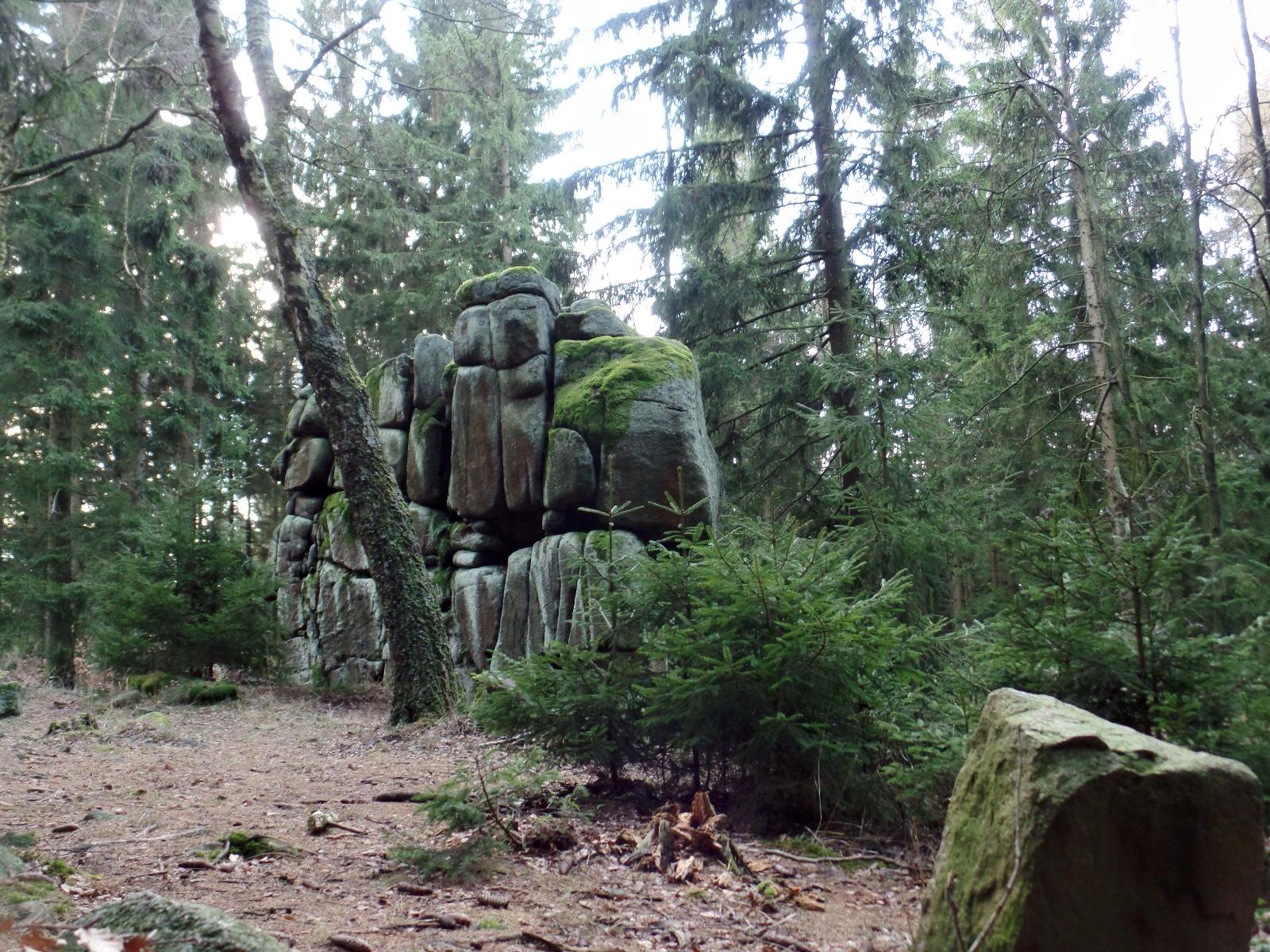 The surface monument is a group of granite rocks on which the so-called wool sack weathering is clearly visible. The interaction of physical and chemical processes results in rounded-edged blocks of rock that lie stacked on top of each other like pillows, mattresses or even wool sacks