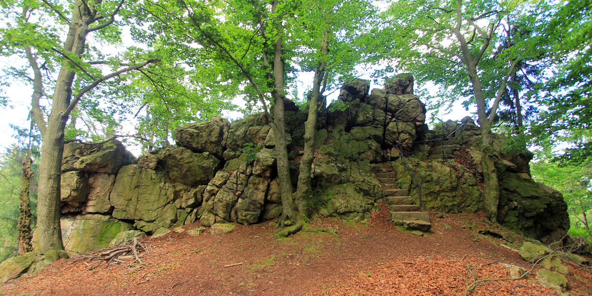 Der imposante Granitfelsen kann über in den Fels gehauene Stufen bestiegen werden und bietet einen schönen Blick auf Bad Harzburg und das Harzvorland.