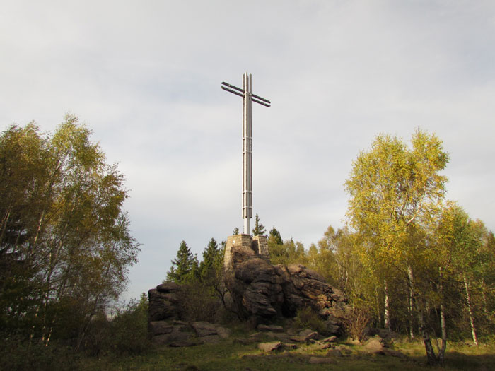 Vom Burgberg aus führt der mittlere Weg, beschildert mit einem roten Dreieck und einer 2 im weißen Kreis markiert, zum „Kreuz des deutschen Ostens“ (555 m ü. NN) auf der Uhlenklippe.